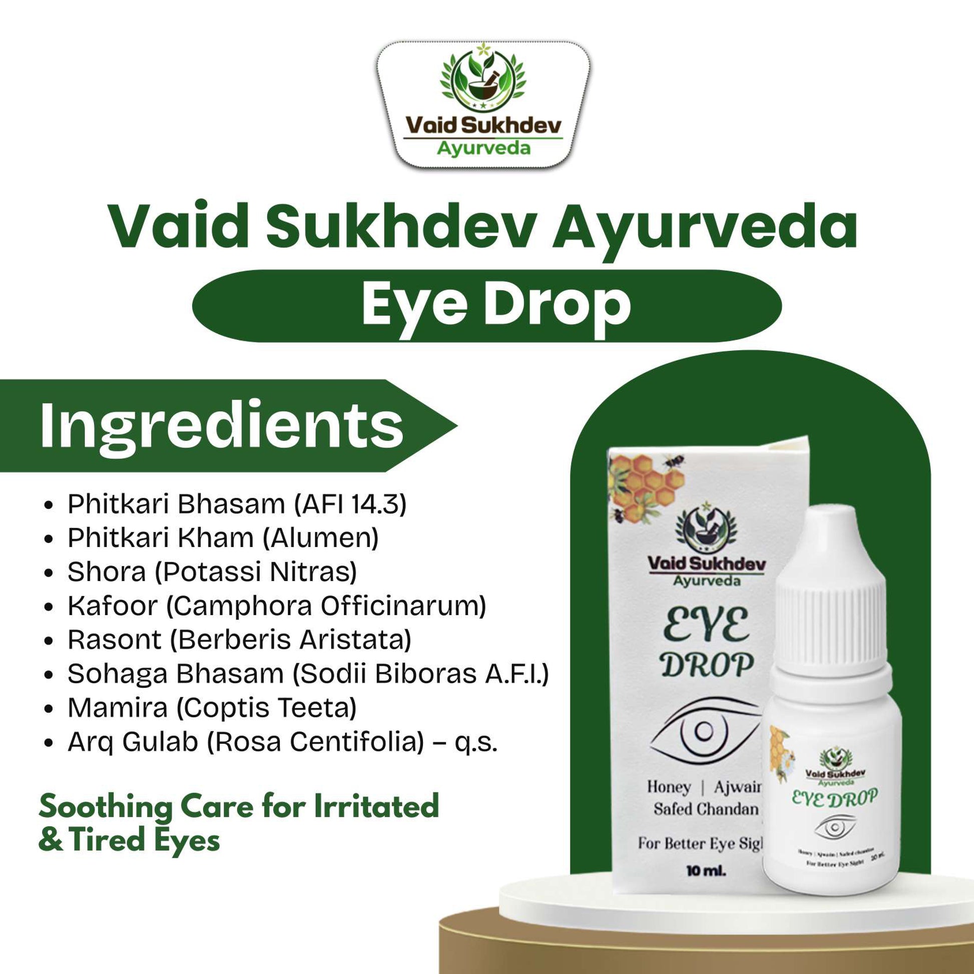 Discover the natural way to healthier eyes with Vaid Sukhdev Ayurveda Eye Drop, enriched with Honey, Ajwain, and Safed Chandan. This Ayurvedic eye drop refreshes, cleanses, and protects your eyes from strain, dryness, and irritation caused by pollution, digital screens, and everyday stress.